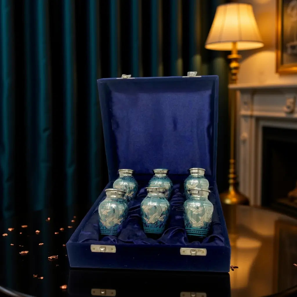Set of Six Keepsakes: Includes six identical miniature urns, perfect for sharing a small, token amount of ashes with family members.